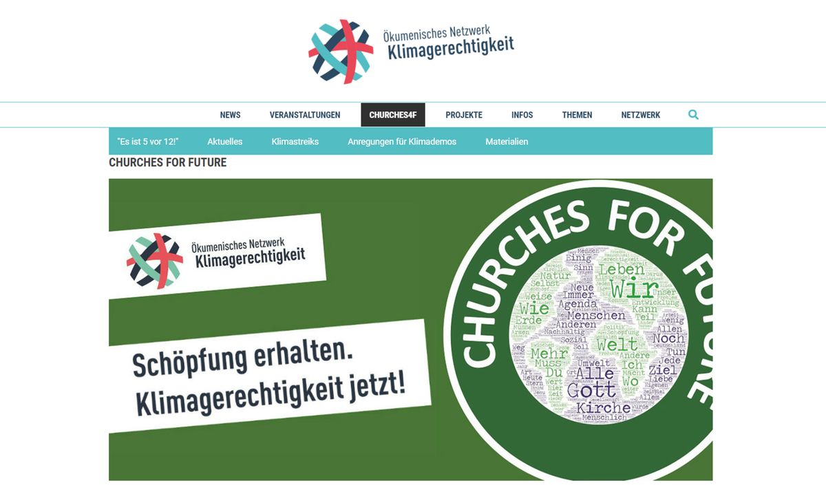 Mitglieder des Ökumenischen Netzwerks Klimagerechtigkeit haben „Churches for Future“ initiiert, mehr als 80 Landeskirchen, kirchliche Einrichtungen, Dienste und Werke haben diesen Aufruf bereits unterzeichnet. Dort heißt es: „Seit vielen Jahren setzen auch die Kirchen sich für Klimagerechtigkeit ein, aber wir bekennen, dass auch wir noch zu wenig tun und nicht konsequent genug sind in der Umsetzung unserer eigenen Forderungen. Wir beziehen daher den Ruf der jungen Menschen zur Umkehr auf uns und nehmen ihn ernst. Er erinnert uns an Kernaussagen des christlichen Glaubens zur Bewahrung der Schöpfung und zur Solidarität mit unseren Nächsten.“