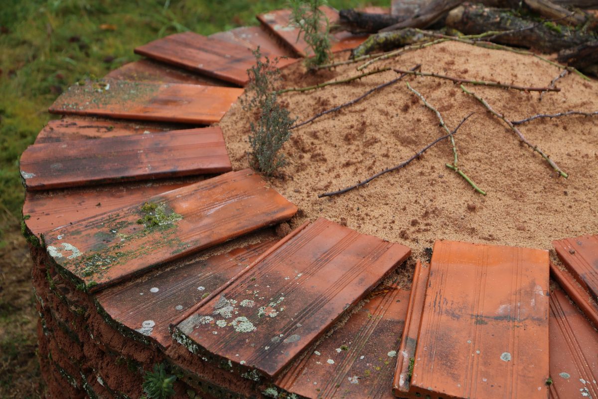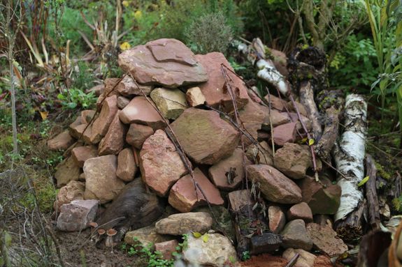 Neben dem Sandarium haben die Müllers noch weitere Dinge im Garten, die ein Lebensraum für Tiere und Insekten sind. Da wäre eine Reptilienburg – ein Steinhaufen, der zum Beispiel für Eidechsen ein Zuhause ist. Ein Käferkeller, wo sich in einem mit Totholz gefüllten Erdloch Insekten einnisten können, und ein Totholzhaufen, in dem sich Vögel oder Igel wohlfühlen können. Selbst die Wiese ist bis auf ein paar Fußpfade nicht gemäht, was Heuschrecken und andere Insekten anzieht.