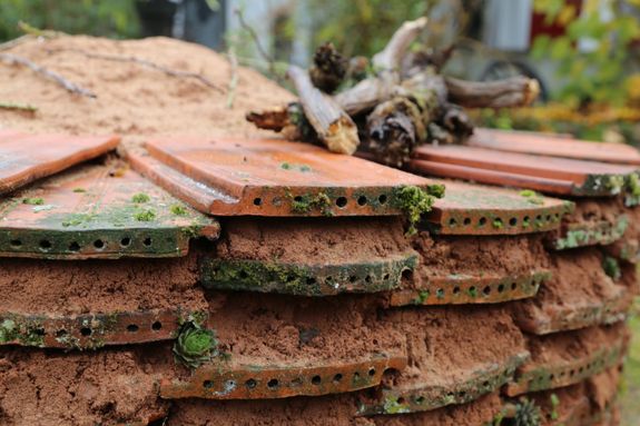Gebaut haben es Müller und seine Frau zusammen mit einem Familienfreund und zwei Nachbarsjungen. Sogar das BR-Fernsehen war für die Sendung „Querbeet“ mit dabei. Die Materialien wurden sorgfältig ausgewählt. Für ein Sandarium brauche es ungewaschenen Grubensand, erklärt Müller. Sonst würden die Tunnel, welche die Wildbienen bauen, nicht halten. Die Ziegel, die das Grundgerüst des Sandariums bilden, bieten einen zusätzlichen Lebensraum, denn in den Röhren der Ziegel können weitere Arten von Wildbienen leben. Sogar im Totholz auf der Oberfläche des Sandariums können sich Wildbienen einnisten. Die 250 Ziegel sind zudem von einer 100 Jahre alten Scheune, die abgerissen wurde. So wird das Projekt im doppelten Sinne nachhaltig. Die Dornenäste sind letztlich ein Schutz vor Katzen, damit aus dem „All-inclusive“-Bienenhotel kein Katzenklo wird.