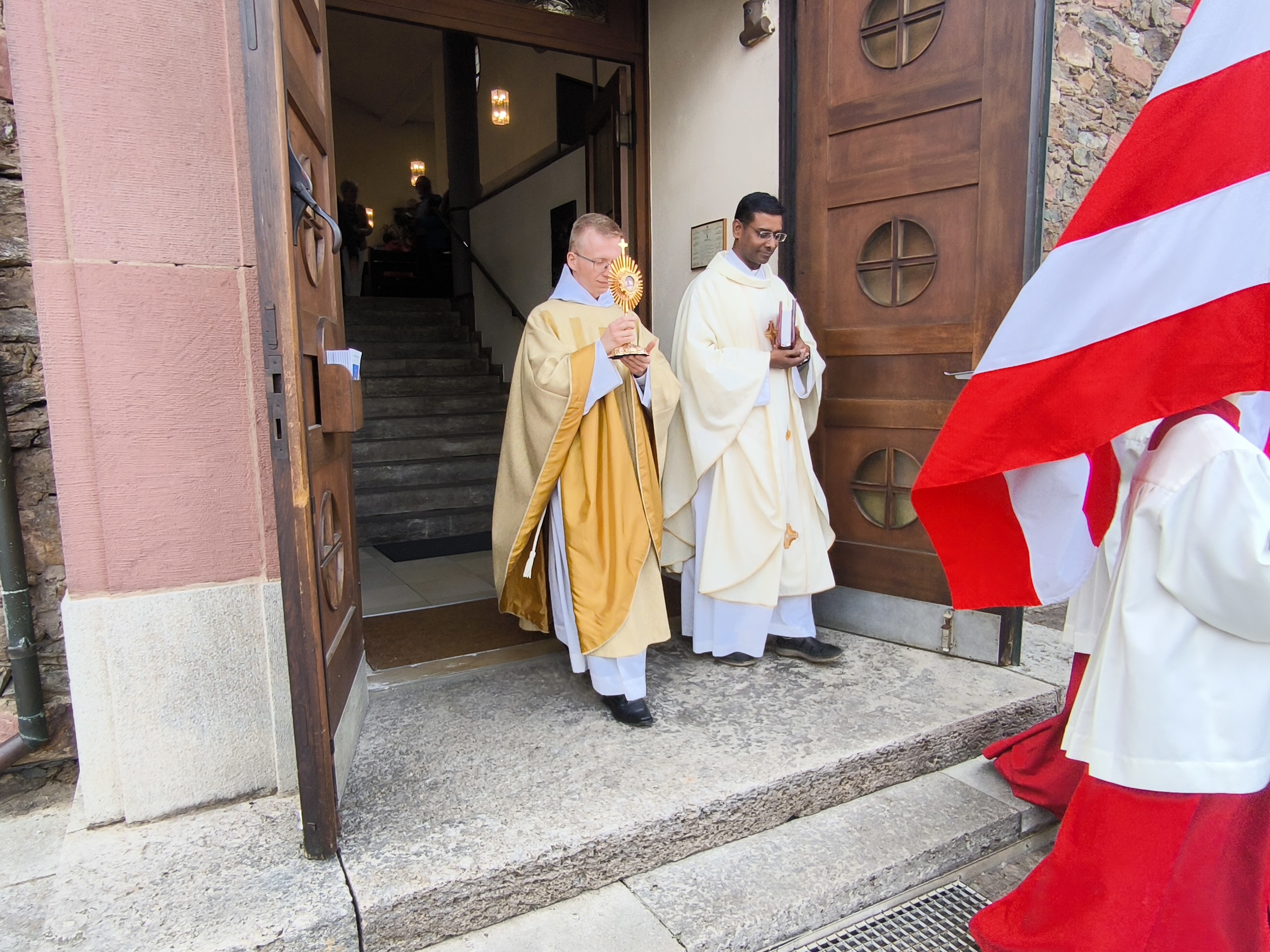 Die Prozession endete am Pfarrheim St. Martin, wo das Pfarrteam zu "Weck, Woi und Worscht" zugunsten von Projekten der Pfarrgemeinde einlud. Dies bot auch eine gute Möglichkeit, Pater Simon Schrott im "neuen Gewand" zu begegnen. Das Wiedersehen war herzlich und man tauschte sich aus, wie das Leben der letzten Jahre verlief. Den Wein stifteten die Winzer. Für die Sicherheit auf dem Weg sorgte die Freiwillige Feuerwehr Hörstein.
