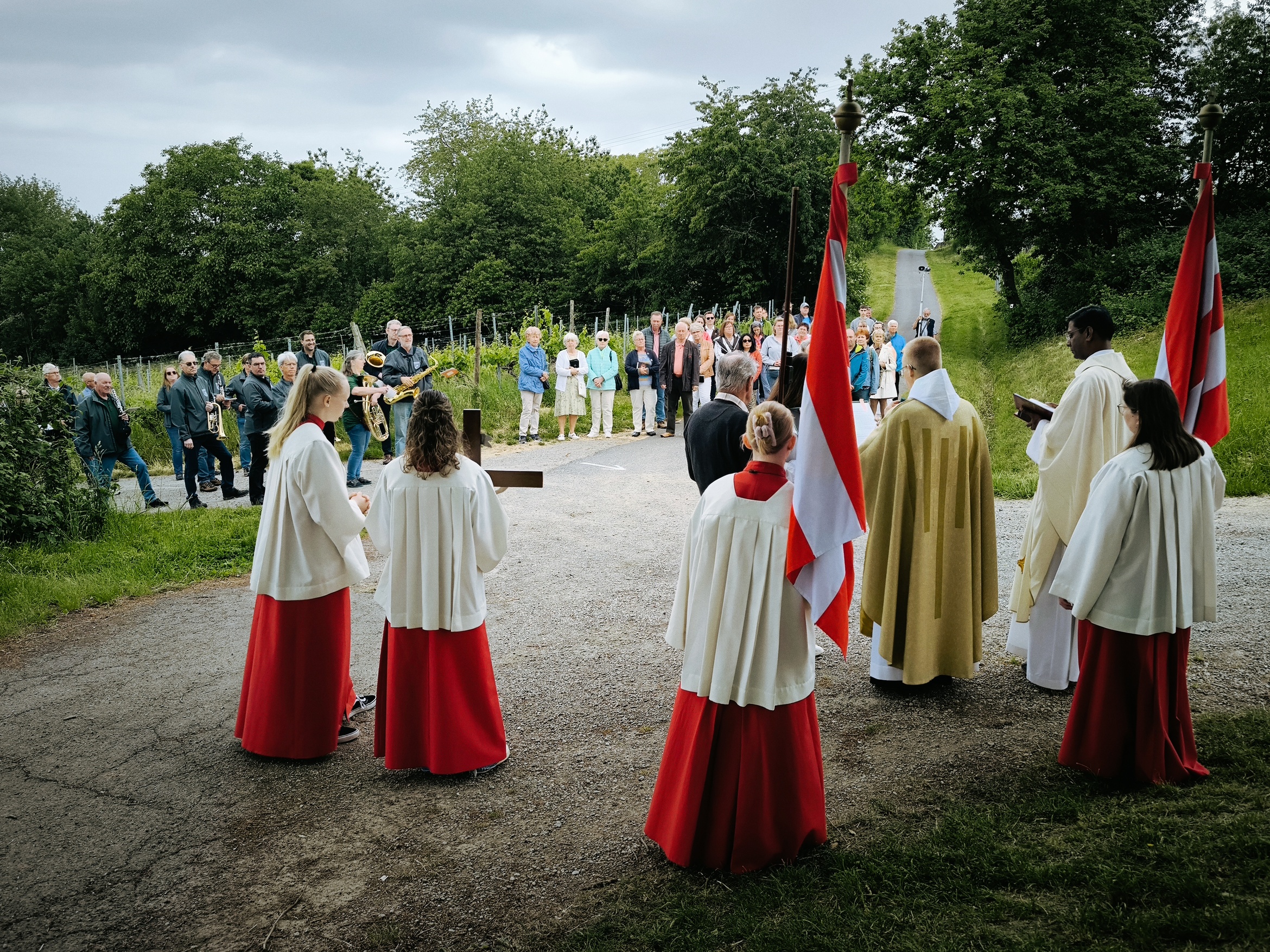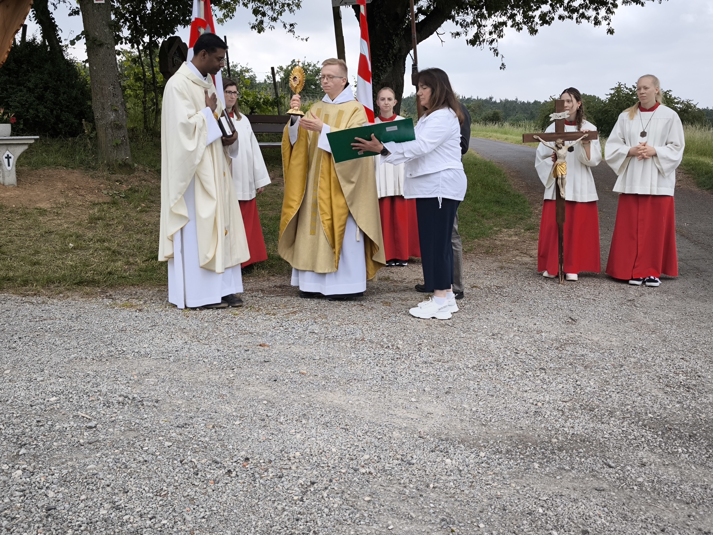 Pater Schrott spendete an der Statio im Mittleren Röderweg den Wettersegen. Dabei waren die Gläubigen von dem dort neu aufgestellten Kreuz mit Altärchen fasziniert. Dazu soll es noch in diesem Jahr eine Andacht mit Segnung geben.