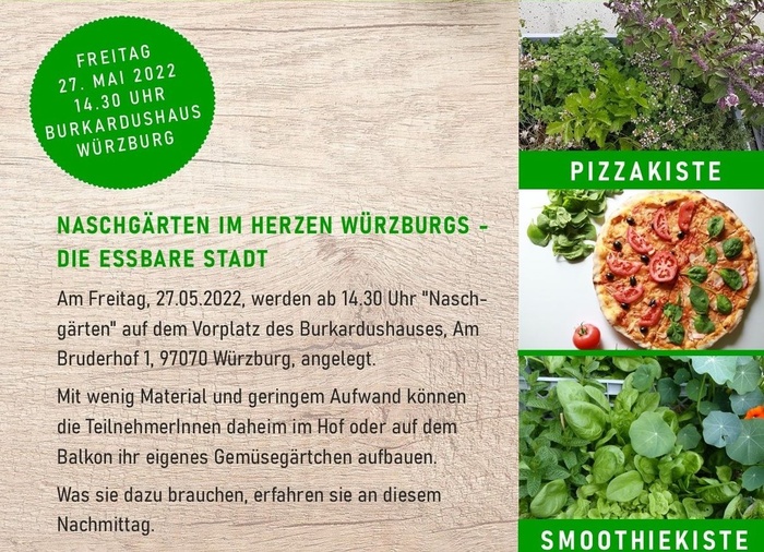 Am Freitag, 27.05.2022, werden ab 14.30 Uhr "Naschgärten" auf dem Vorplatz des Burkardushauses, Am Bruderhof 1, 97070 Würzburg, angelegt.